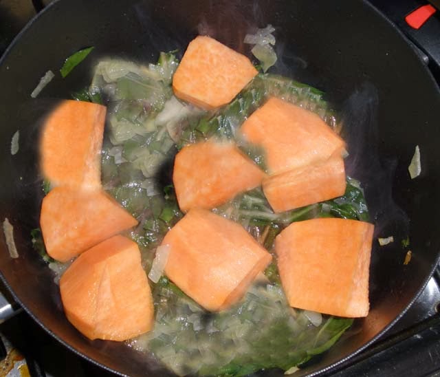 En la olla freímos la cebolla picada, las acelgas cortadas en trocicos y el boniato pelado y también cortado a tacos: